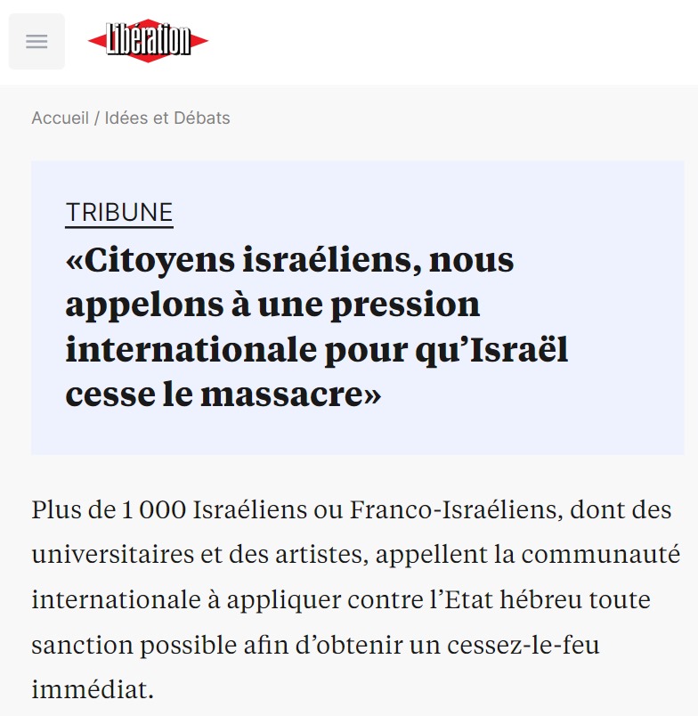 Categories Press «Citoyens israéliens, nous appelons à une pression internationale pour qu’Israël cesse le massacre» Post author By ICFIP Post date October 18, 2024 publié le 18 octobre 2024 https://www.liberation.fr/idees-et-debats/citoyens-israeliens-nous-appelons-a-une-pression-internationale-pour-quisrael-cesse-le-massacre-20241018_A5BW2UKEJBETPMQ5IU74JWKSTU ← יותר מ-950 חתמו על עצומה הדורשת להטיל סנקציות על ישראל למען הפסקת אש → Des citoyens israéliens appellent à imposer un cessez-le-feu immédiat